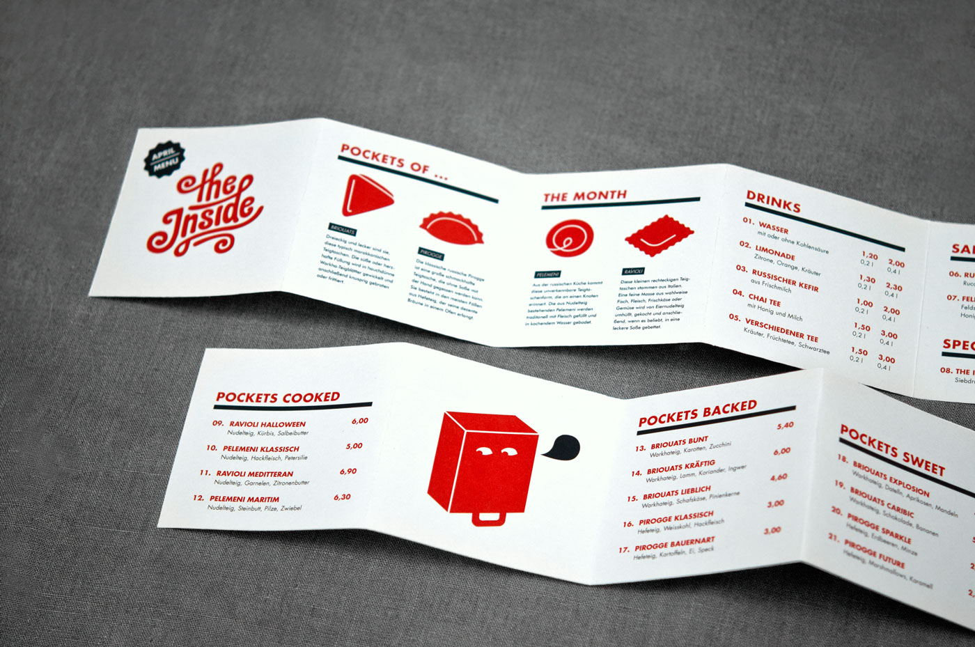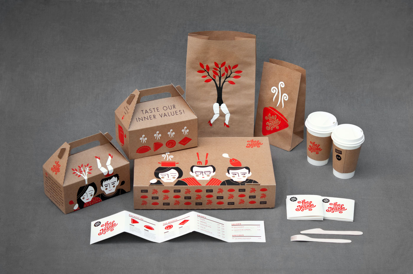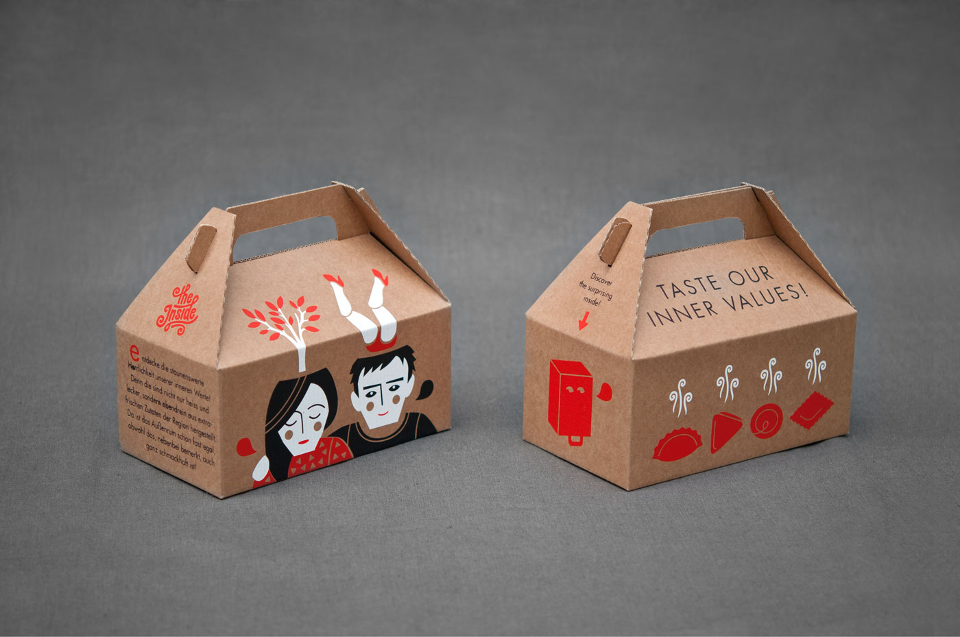 Bachelor Thesis / Concept and Packaging The fast casual restaurant "The Inside" is specialized in tasty dumplings: baked, fried or boiled, according to traditional recipes of distant lands, or as extravagant taste creations.